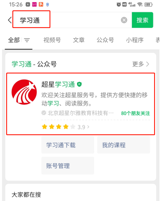 1、在微信中搜索“学习通”公众号,点����� �������Ƴ������������ �������Ƴ������������ �������Ƴ������������ �������Ƴ�������击“超星学习通”微信公众号并����� �������Ƴ������������ �������Ƴ������������ �������Ƴ������������ �������Ƴ�������进行关注。