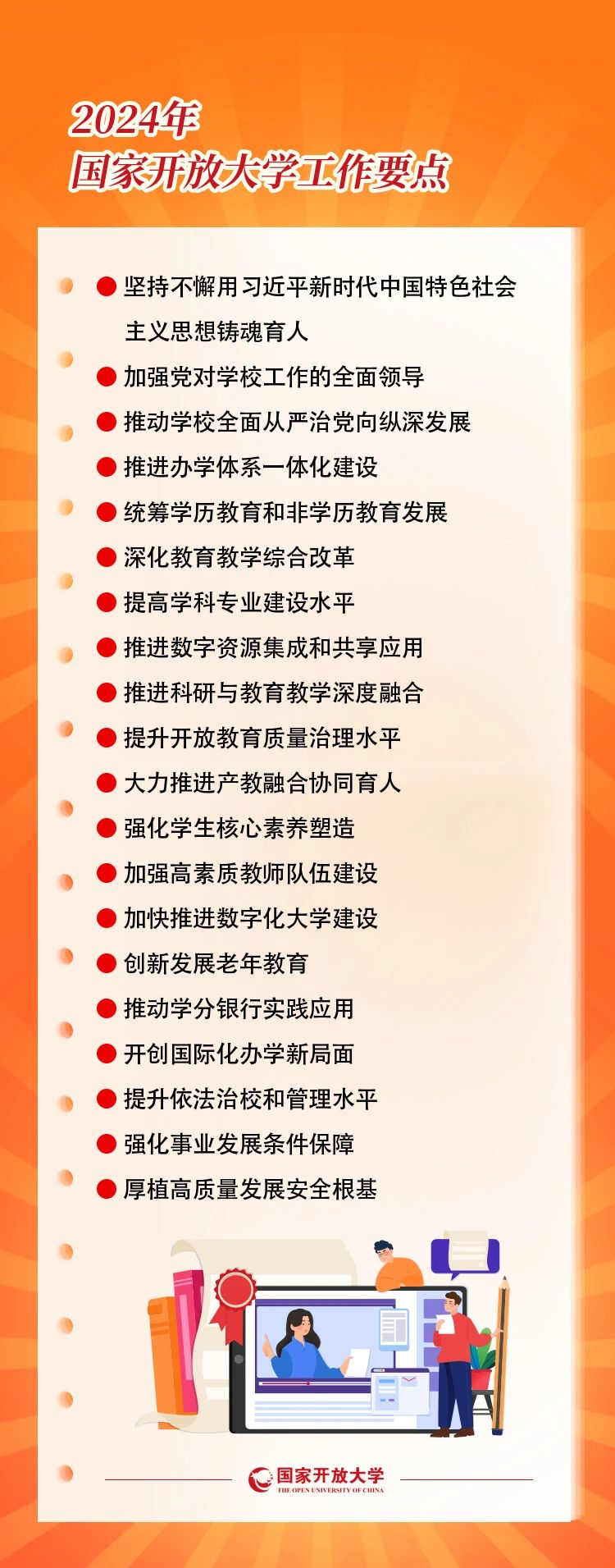 2024年,学校工作����� �������Ƴ������������ �������Ƴ������������ �������Ƴ������������ �������Ƴ�������的总体思路是:坚持以习近平新时代中国特����� �������Ƴ������������ �������Ƴ������������ �������Ƴ������������ �������Ƴ�������色社会主义思想为指导,全面贯彻党����� �������Ƴ����������� �������Ƴ������������ �������Ƴ������������ �������Ƴ�������的二十大精神,深刻领悟“两����� �������Ƴ������������ �������Ƴ������������ �������Ƴ������������ �������Ƴ������个确立”的决定����� �������� �������Ƴ������������ �������Ƴ������������ �������Ƴ������������ �������Ƴ�����������Ƴ�������性意义,增强“四����� �������Ƴ������������ �������Ƴ������������ �������Ƴ������������ �������Ƴ�������个意识”,坚定“四个自信”,做到“两个维护”,����� �������Ƴ������������ �������Ƴ������������ �������Ƴ������������ �������Ƴ�������深入学习贯彻习近平总书记关于教育的重����� �������Ƴ������������ �������Ƴ������������ �������Ƴ������������ �������Ƴ�������要论述,完整、准确、全面贯彻新发展理念,坚持稳中����� �������Ƴ������������ �������Ƴ������������ �������Ƴ������������ �������Ƴ�������求进、以进促稳、先立后破����� �������Ƴ������������ �������Ƴ������������ �������Ƴ����������� �������Ƴ�������,贯彻落实《教育强国建设����� �������Ƴ������������ �������Ƴ����������� �������Ƴ������������ �������Ƴ�������规划纲要》,����� ��������� �������Ƴ������������ �������Ƴ������������ �������Ƴ������������ �������Ƴ����������Ƴ�������认真落实教育����� �������Ƴ������������ �������Ƴ������������ �������Ƴ������������ �������Ƴ�������部党组年度工作部署,全面落实《国家开放大学综合����� �������Ƴ������������ �������Ƴ������������ �������Ƴ������������ �������Ƴ�������改革方案》《国家开放大学“十四五”事业发展规����� �������Ƴ������������ �������Ƴ������������ �������Ƴ����������� �������Ƴ������划》《国家老年大学筹建工作方案》,以立德树����� �������Ƴ������������ �������Ƴ������������ �������Ƴ������������ �������Ƴ�������人为根本任务,以服务学习型社会����� �������Ƴ����������� �������Ƴ����������� �������Ƴ������������ �������Ƴ�������建设为战略主线,实施“八大工程”����� �������Ƴ������������ �������Ƴ����������� �������Ƴ����������� �������Ƴ������������ �������Ƴ����� �������Ƴ������������ �������Ƴ������������ �������Ƴ������������ �������Ƴ��������������和“两项行动”,深化教����� �������Ƴ������������ �������Ƴ����������� �������Ƴ����������� �������Ƴ�������育教学综合改革,持续提升开放大学办学����� �������Ƴ������������ �������Ƴ������������ �������Ƴ������������ �